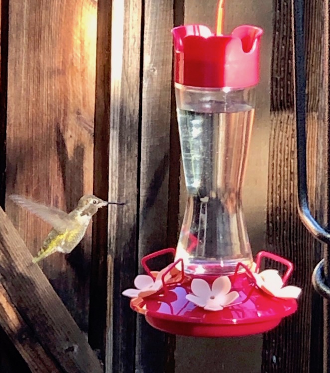 A hummingbird at the feeder. One of several (distinguishable by color) that now come for the syrup in the feeder; this one is yellow: