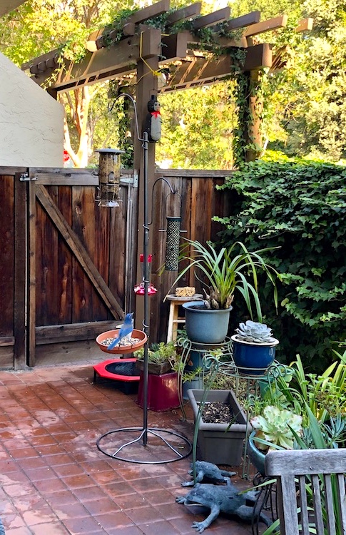An overview of one end of the patio (with the gate from my walkway and the arbor over the walkway), where the feeding apparatus lives, so that it’s visible to me from inside the house, while I’m at my work table; birds flutter down from the sky constantly, and my four squirrels can feed within my sight — and they can leap from the arbor into the big crape myrtle tree on the street, and from there into california live oak trees: