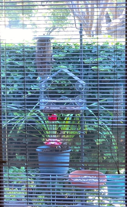 (#4) Showing the whole bird feeder pole system, plus one of two feeders affixed to the outside of the windows