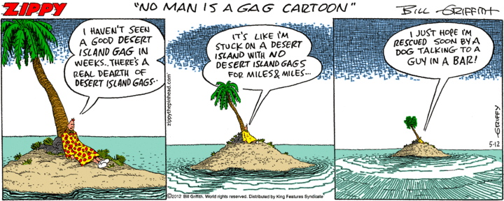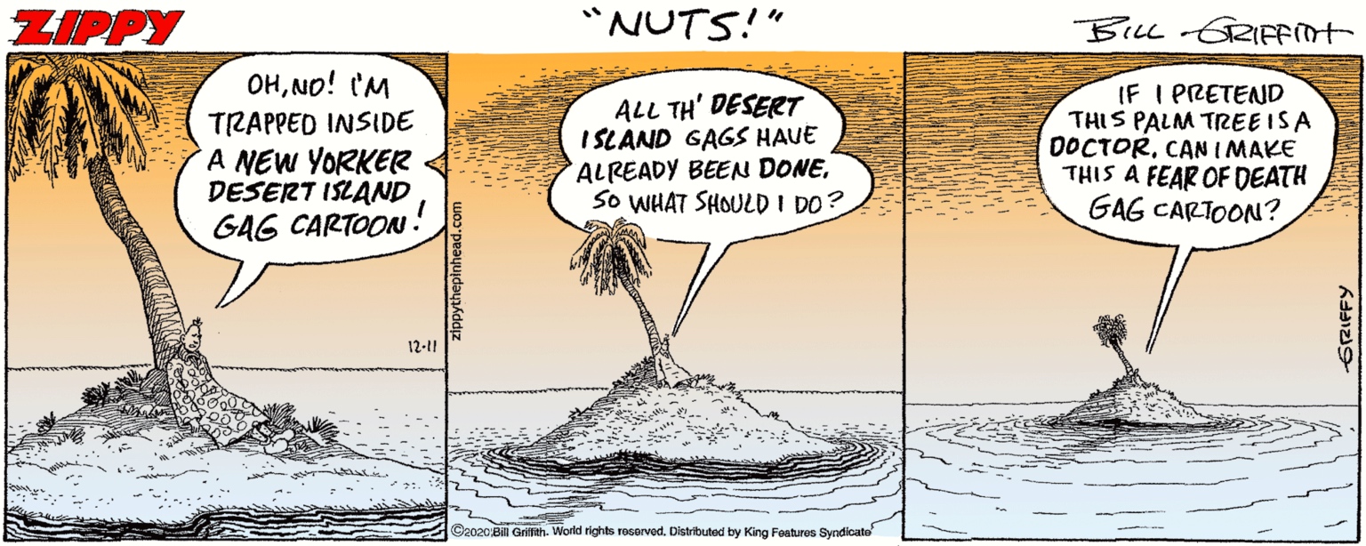 The 12/11 Zippy cartoon contemplates fear of death on a New Yorker desert island: