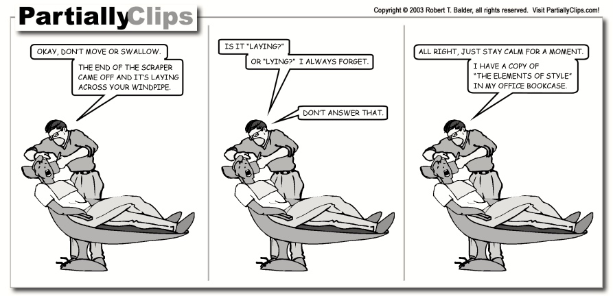 Geoff Pullum on Language Log, 5/10/04 (“Lie or lay? Some disastrously unhelpful guidance”) takes off from this Partially Clips cartoon —
