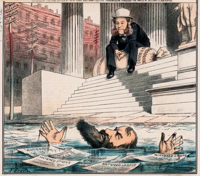 Under water. A Friedrich Graetz cartoon from Puck ca. 1883: Jay Gould drowning in sea of watered stock, as William Vanderbilt looks on: