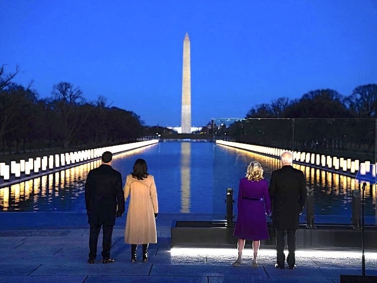 One, a Facebook note from Max Vasilatos (prominently quoting MLK’s “We must accept finite disappointment, but never lose infinite hope”) about pretty much everyone (me too) crying at yesterday’s twilight ceremony at the reflecting pool (by the Lincoln Memorial), memorializing 400,000 Covid deaths, on the eve of the inauguration of Joe Biden as President and Kamala Harris as Vice-President — on the Erev Inauguration (as Adrienne Shapiro put it on her FB page: the eve of a holy day).