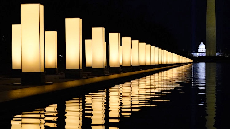 (#2) Lights [400 of them] surround the Lincoln Memorial Reflecting Pool, placed as a memorial to COVID-19 victims on Tuesday. [in the background: the Capitol building] (photo: Alex Brandon/AP)