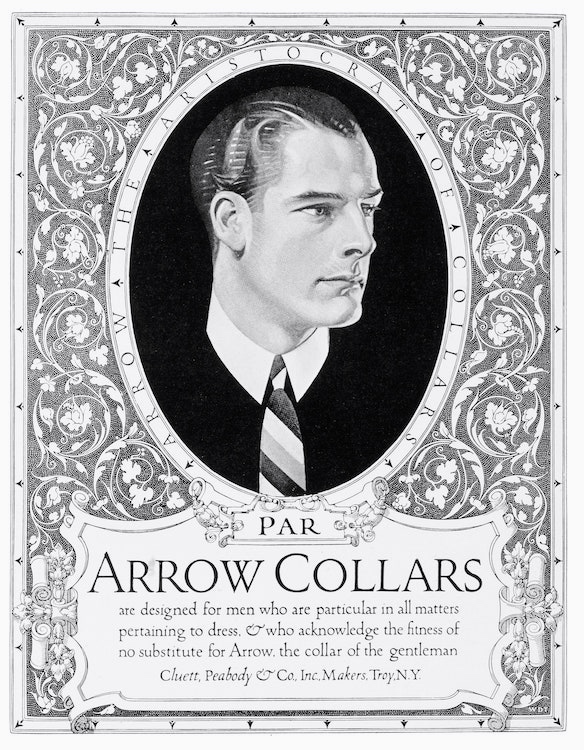 If you were a man living in the early part of 20th century America, you probably knew who the Arrow Collar Man was. Created in 1905, the Arrow Collar Man was the name given to various male models who appeared in magazine and billboard advertisements for Arrow collars and shirts. Illustrator J.C. Leyendecker was the artist behind the ads. His unique artistic style gave the Arrow Collar Man a very angular, modern, and American look. The men always had very squared-off, masculine jaw lines with perfectly coiffed hair. The ads were designed to create a feeling of success, sophistication, and masculine virility in customers.