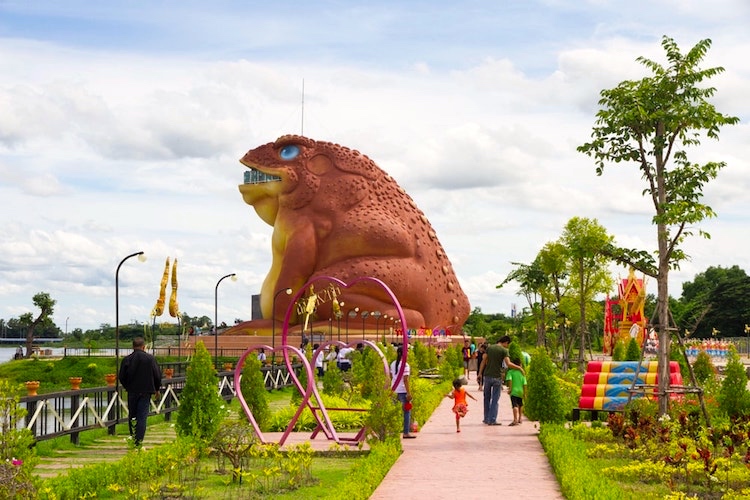 (#3) (Culture Trip caption) Just a giant toad next to Yasothon’s river! (photo: nuttavut sammongko / Shutterstock)The toad’s belly contains displays related to tourism in the province and information about the legend of Praya Kankak, a local toad prince who bargained with the rain god to prevent the lands from being flooded. It is said that the toad prince and the rain god agreed from that point on, people should launch rockets to signify that they wish rain to come.