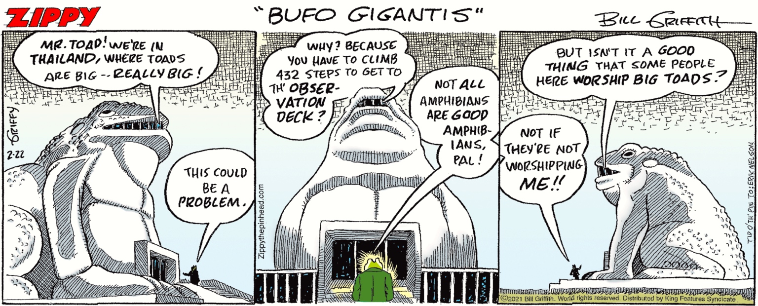 The Zippy for today (2/22), in which Mr. Toad, reflecting on the Gigantic Toad of Yasothon, Thailand, observes that “not all amphibians are good amphibians” — which will take us to Rhinella marina, the giant cane toad:
