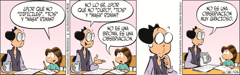Ah! Baldo is written in English, then translated into Spanish, in this case without attention to the point of the English cartoon — which hinges crucially on the pronunciation of -OUGH words in English. Oi.