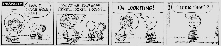 I have a vivid memory of a comic panel or strip featuring young children, and I apologize for not remembering which one, in which one child says excitedly to the other, “Lookit! Lookit!” and the other replies, “I’m lookiting.”