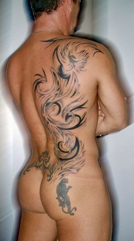 There’s been no widespread fashion for lumbar tattoos in men, and most of ones you can find on the net are dedicated to family members or sports figures, but there are some explicitly gay ones (a triangle pointing down to the bearer’s ass cleft; a tattooed star, which often serves as a declaration of homosexuality) and this bit of body art in the middle of a three-part tattoo — a top design (covering the right half of the man’s back, from shoulder to lower back), the lumbar design, and a black panther on his right buttock: