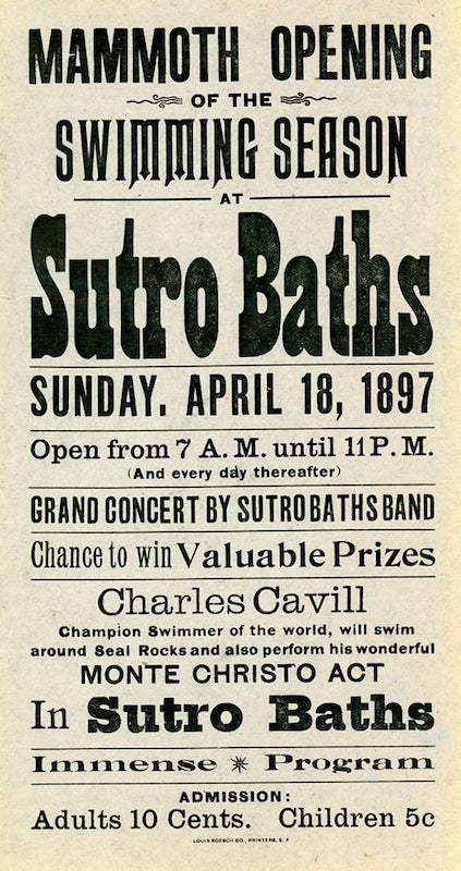 Built in 1896 [and billed as the world’s largest indoor swimming pool establishment], the Sutro Baths, was located north of Ocean Beach, the Cliff House, Seal Rocks, and west of Sutro Heights Park. The structure burned down to its concrete foundation in June 1966