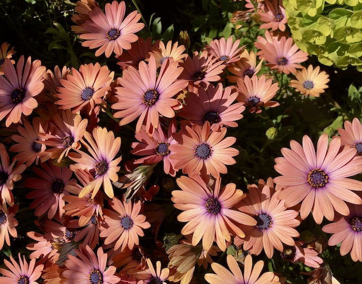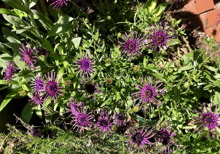 Two composite plants of a familiar sort — African daisies (which of course are not actually daisies), but both of unfamiliar varieties — one in an unusual color: