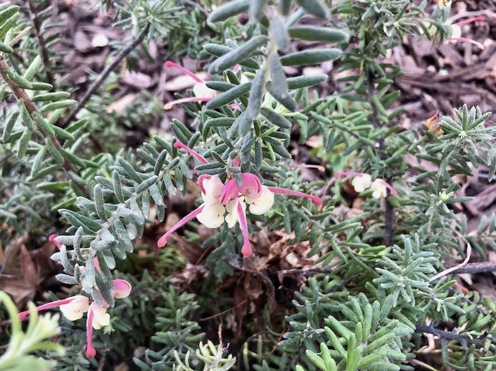 Ah, but it turns out that the genus embraces an extraordinary variety of plant forms, including many shrubby or even prostrate species, most of which have been cultivated and hybridized, yielding many dozens or perhaps hundreds of named low-growing cultivars. My mystery plant is probably not Grevillea lavandulacea ‘Penicola’, but it might be Grevillea lanigera (woolly grevillea) ‘Coastal Gem’ (a UCSC creation, so genuinely local), though my current top candidate is Grevillea lanigera ‘Mt Tamboritha’, in part because that cultivar is enormously popular. It has its own Wikipedia page, in fact: