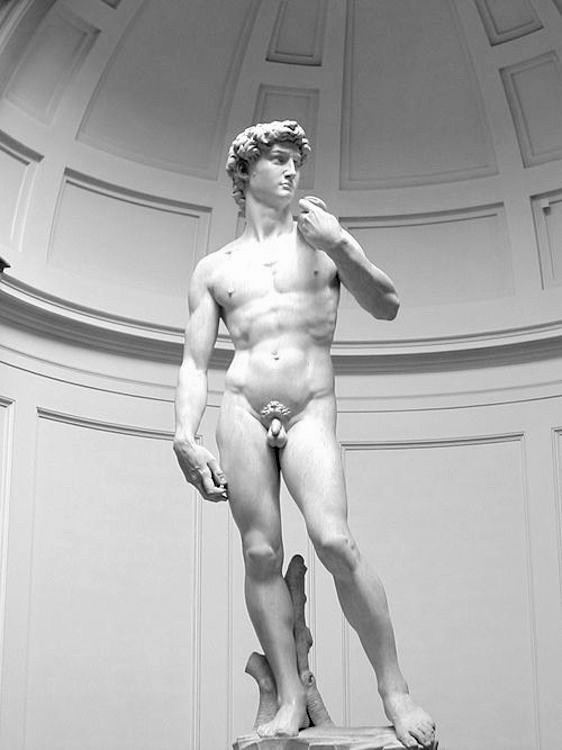 Contrapposto (weight on the right leg, left knee raised) but without the Praxiteles head pose; David is looking to his left, but upwards. As for his package, it’s not at all conspicuous, and wasn’t meant to be, but a great many visitors to the original in Florence apparently consider it to be the major draw.