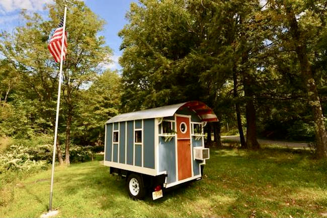 The portable home/glamper/’vardo’ caravan was built by Chris Schapdick, award-winning Tiny House builder based in New Jersey.