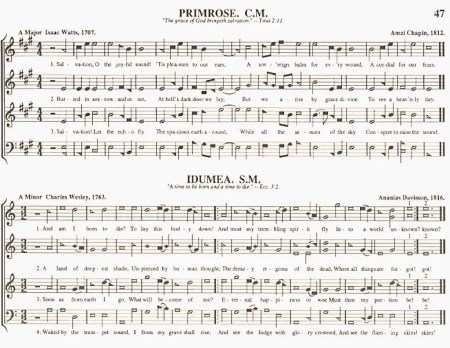 (#1) SH47t Primrose and SH47b Idumea — both from the early flowering of shapenote music in the South in the early 9th century, both on salvation and resurrection, in Primrose (in A major) merely joyous; in Idumea (in A minor), triumphant, as part of the Apocalypse — texts from two amazingly prolific writers of hymn texts, Isaac Watts in Primrose, Charles Wesley in Idumea