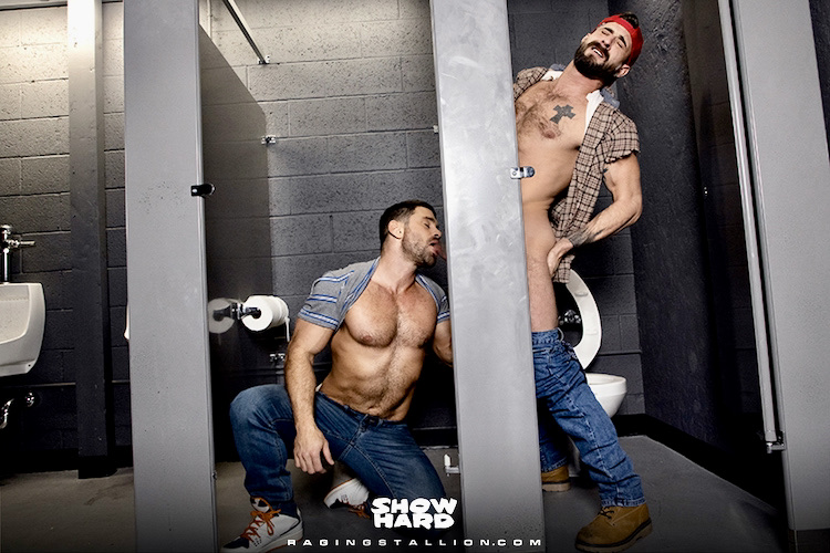 When you’ve been out on the road for a while and need an intense release, you can find a seedy roadside rest stop, where the men inside ‘SHOW HARD’ [show their hard-ons] to signal they’re ready for some hot, raw action. Award-winning director Tony Dimarco captures the raunchy bareback chronicles of spontaneous public restroom sex with eight hung and horny men eager to bust a nut. Beau Butler stops for a bathroom break and ends up getting his ass pounded deep by Sean Maygers … [on through 4 more scenes]