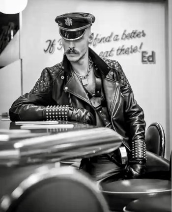 Leather enters into these things in several ways. Through the sensual attractions of the material, in touch and smell. Through its supple strength and warmth, which make it a good material for sturdy garments, in particular, uniforms of many kinds (and also for restraining devices) — uses that gave rise to a (general) male leather subculture associated with motorcycles and motorcycle gangs and to a specifically gay leather subculture focused on leather uniforms of many kinds (for their high masculinity and their concordance with bdsm practices and subcultures), as celebrated especially in the homoerotic art of Tom of Finland.