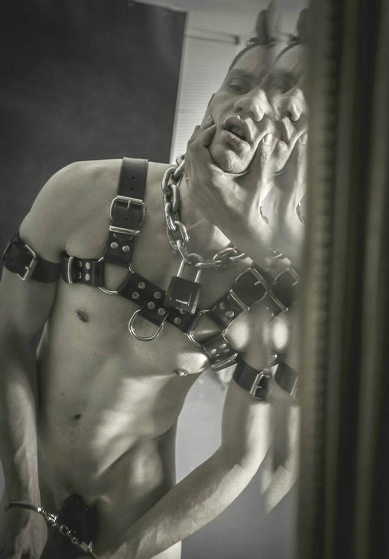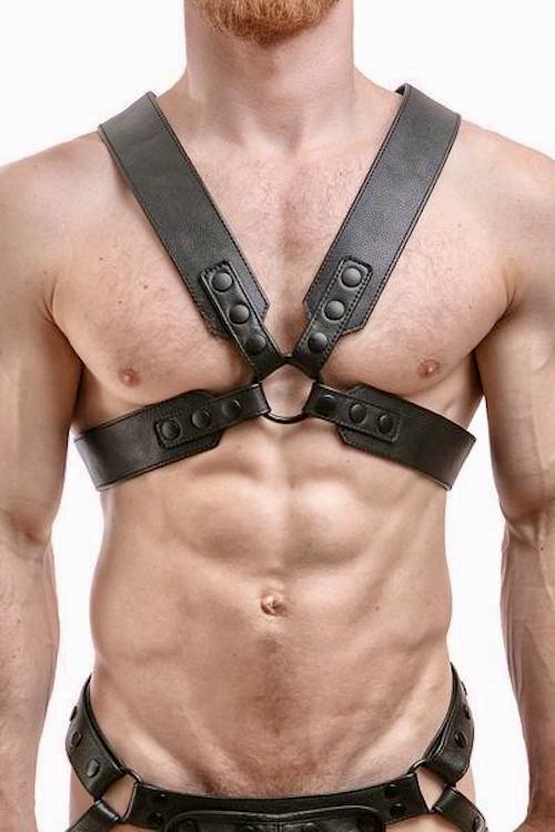 On a man, a harness, especially a black leather one, is a display of the wearer’s body and a projection of masculinity, in combination with a presentation of the wearer either as a dominant stud or as a submissive.