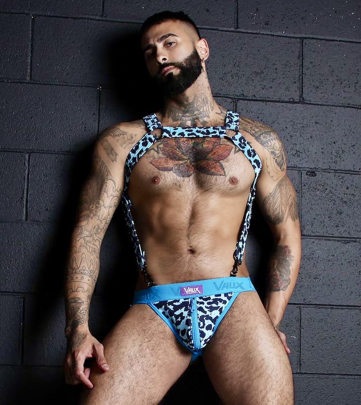 (#3) Muscle hunk, front view, bulldog harness, torso straps, and zipppered jockstrap, in Vaux’s Leopard Blue pattern