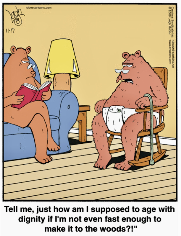 The Aging Bear. If you’re a bear, you shit in the woods;, everybody knows that. But as you age, those weary bones and painful joints make it hard to get across the room fast, and harder still to make it to the woods in time:
