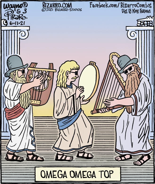 The title of the cartoon. I’m still puzzling over the non-parallelism between the names of the musical groups in English and Greek: not ZZ Top and Ω Ω Top (letter-symbols in both languages) or Zee Zee Top and Omega Omega Top (letter-names, as spelled in English, in both languages), but the mixed ZZ Top and Omega Omega Top. Maybe Wayno wanted to avoid the /zi/ (spelled Zee) vs. /zɛd/ spelled Zed) issue, but as I noted above, that’s irrelevant, since ZZ Top always has /zi/. But I’ll send him a copy of this posting, so he can have his say, if he wants. (It’s a small, pedantic, point; nothing that makes the cartoon so complexly funny hinges on it.)