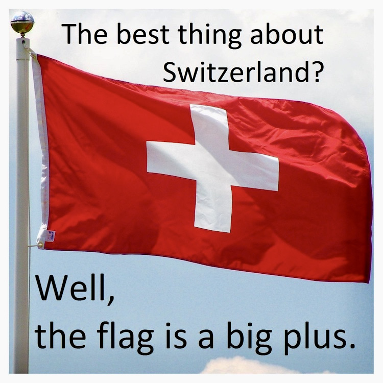 Yes, of course. I spent an hour or so trying to find an image that had the joke, showed the “big plus” of the flag, and (most difficult of all) didn’t require a payment for use. My image files had a nice Swiss flag, period, but from years ago, and I certainly didn’t pay anyone for it, but I guess I could have used it and paired it with a second image with the joke alone (and used the joke text, typed in, as a caption). I should have noticed that the flag wasn’t square, though.
