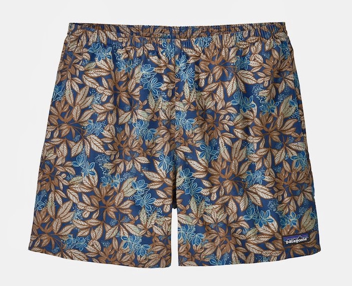 Patagonia. The company treats its Baggies™ shorts mostly as sportswear but also advertises them as lounge shorts. From its website on Baggies, advertising its material: “lightweight yet durable 100% recycled nylon”. Patagonia advertises them in a range of intense colors and in some patterns, including the handsome Hevea Leaves: Superior Blue (men’s 5″):