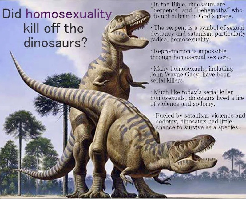 Speaking of S, I, & C 2 G W, the other really popular gay dinosaur visual is, I hope, also a joke, a broad mockery of fundangelist spewing against faggots: satanism, violence, and sodomy! (Door #3 for me, please.) A mockery, rather than the actual vile thing: