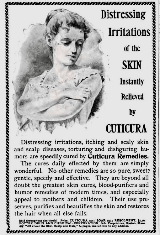 (As far as I know, not actually used as an advertising slogan for any of the line of Cuticura skin care products — probably too jaunty and wise-cracking for the company, which seems to have been marketing primarily to women since 1865.)