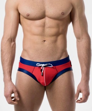 The briefs. PUMP!’s Water Briefs come in red/navy, blue/green, coral, and black (they’re handsome indeed, though outrageously costly); their features include UPF 50+ protection (no sunburned crotches!), a drawstring (for cinching or relaxing), and white piping accentuating the cup (to draw attention to your package). The latter two features are visible in this front view of the red/navy number: