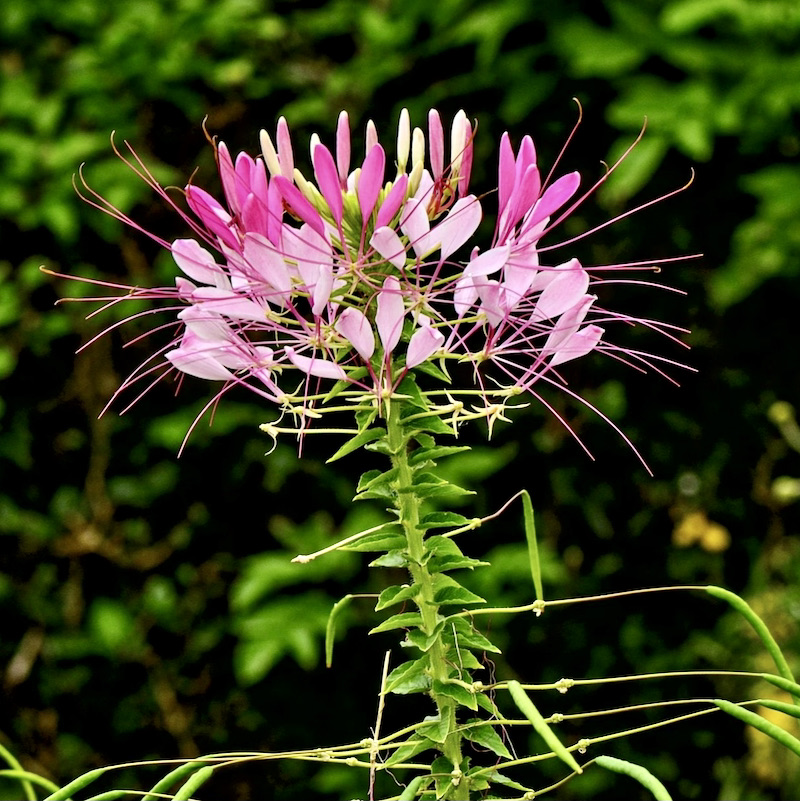 (#2) A cleome flower close up (photo: Sow True Seed company)Cleome hassleriana, commonly known as spider flower, spider plant, pink queen, or grandfather’s whiskers, is a species of flowering plant in the genus Cleome of the family Cleomaceae, native to southern South America in Argentina, Paraguay, Uruguay, and southeast Brazil. It has also been introduced to South Asia, including the Haor area of Bangladesh and India.