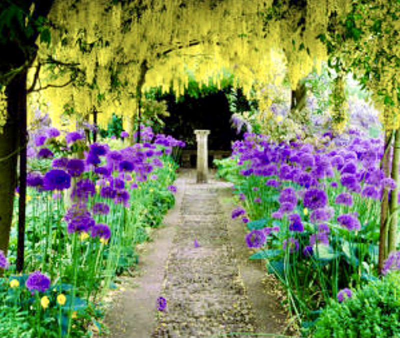 (#4) “Golden Chain”: laburnum (the yellow), drumstick allium (the purple and blue), and a garden path with a bench to rest on at the end