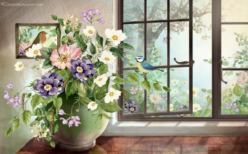 — from Rod [Williams] & Ted [Bush] (in Oakland), a different Jacquie Lawson card, “Birds and Flowers”: an arrangement of flowers to be identified, plus several little chirpy birds, with the accompaniment of a much-abbreviated orchestral arrangement of Chopin’s Grande valse brillante