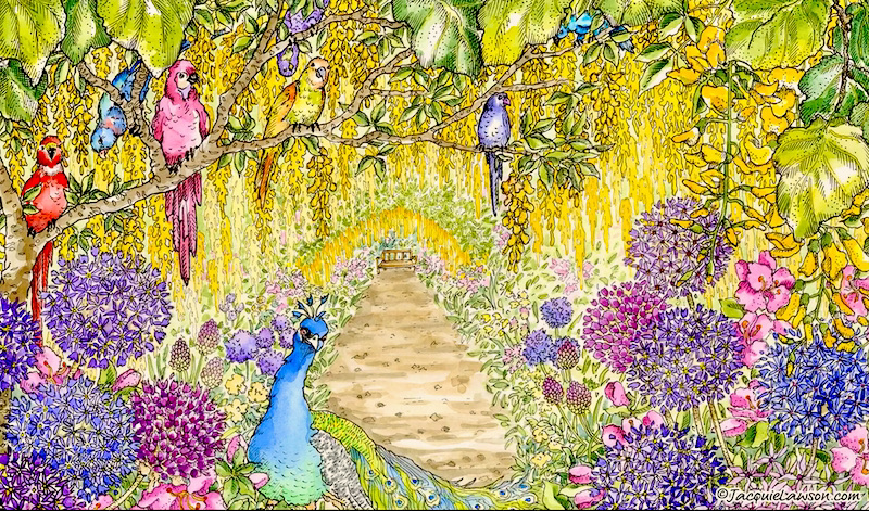 — from Benita and Ed Campbell (outside of Denver), a Jacquie Lawson electronic birthday card, “Golden Chain”: laburnum (yellow), drumstick alliums (purple and blue), plus seven parrots and a peacock