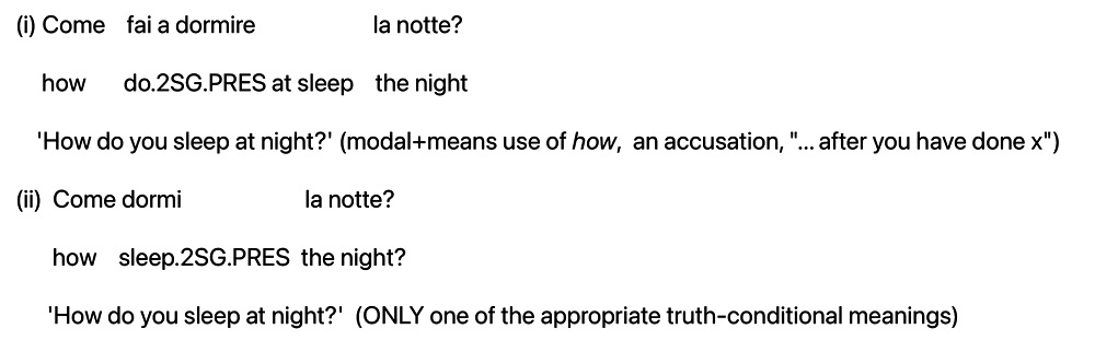 Btw, Italian has two different constructions, (i) one that has a distinct preference for the modal+means how and (ii) the other that seems to admit only one of the appropriate truth-functional ones: