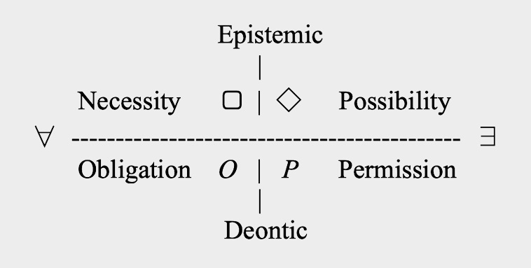 For the reader’s reference, I’ve prepared a cheat sheet (hat tip to Arika Okrent) of the four modal operators I referred to above, arranged in two dimensions: universal ▢ and O (on the left) vs. existential ◇ and P (on the right); and epistemic (having to do with belief and knowledge) ▢ and ◇ (at the top) vs. deontic (having to do with rules and norms) O and P (at the bottom):