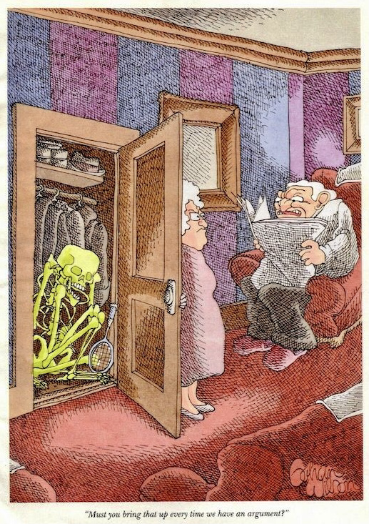 1855 W. M. Thackeray Newcomes II. xvii. 165 Some particulars regarding the Newcome family, which will show us that they have a skeleton or two in theirclosets, as well as their neighbours.