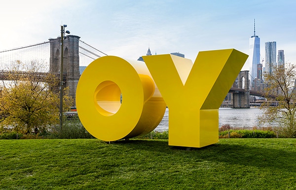 Artistic bonus. From my 11/13/15 posting “The art of interjection”, discussion of this OY / YO (depending on how you look at it) statue by Deborah Kass: