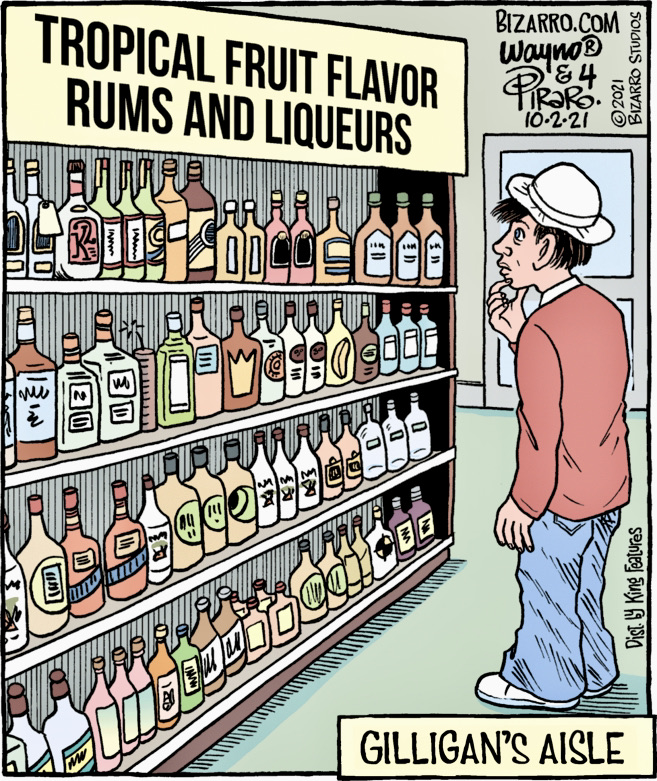 A pun on isle ‘island’ vs. aisle ‘a passage between shelves of goods in a supermarket or other building’ (aisle sense b in NOAD (below)). But none of this makes any sense unless you know significant details of an American tv comedy from about 55 years ago: Gilligan’s Island (1964-67), in particular, that the show was about seven castaways from a shipwreck, including the goofy Gilligan, attempting to survive on a tropical island. Hence the tropical fruit-flavored rums and liqueurs. (It’s a nice subtle touch that the cartoon Gilligan appears to be lost in his attempt to choose a bottle.)
