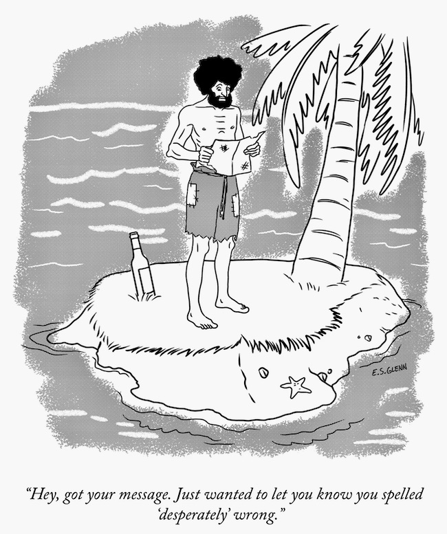 But the central point is the (in this case, wicked) obtuseness of spelling peevers, so intent on pointing out inadvertent typos and also mistaken spellings (the latter presumably being at issue in the cartoon) that they neglect to heed a desperate plea for help from a starving man.