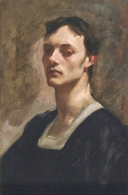 (#8) More Romantic hair; “feminine” eyes: fairly large, fairly far apart, eyelids lowered (these are my eyes) — somehow looking sad hereErnest Schelling was an internationally distinguished American pianist, composer, and conductor. He sat twice to Sargent in the midst of a taxing performance schedule in 1910. Sargent noted that during the sitting, the pianist was “in a condition of total collapse… [but] fortunately his looks held their own.” The portrait exemplifies Sargent’s deft handling of charcoal, as in the swift, firm strokes that animate Schelling’s hair. To create the bright white collar, Sargent left the paper in reserve. Highlights, like those on Schelling’s nose and forehead, were often made by using pellets of bread as an eraser to remove excess charcoal.