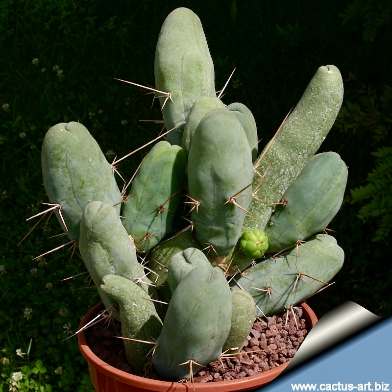 … The monstrose form of Echinopsis lageniformis is known as the penis plant or penis cactus. Contrary to the typical columnar habit of the species, this cultivar displays short stem sections that branch avidly, forming a low spiny bush. The upper part of each stem segment is smooth and spineless, resembling a penis [complete with urethral slit]. The lower part is spiny and shows a tendency to form ribs. The plant is light green. The German name for this cultivar, Frauenglück, more euphemistic than its English equivalent, translates as “women’s joy”.