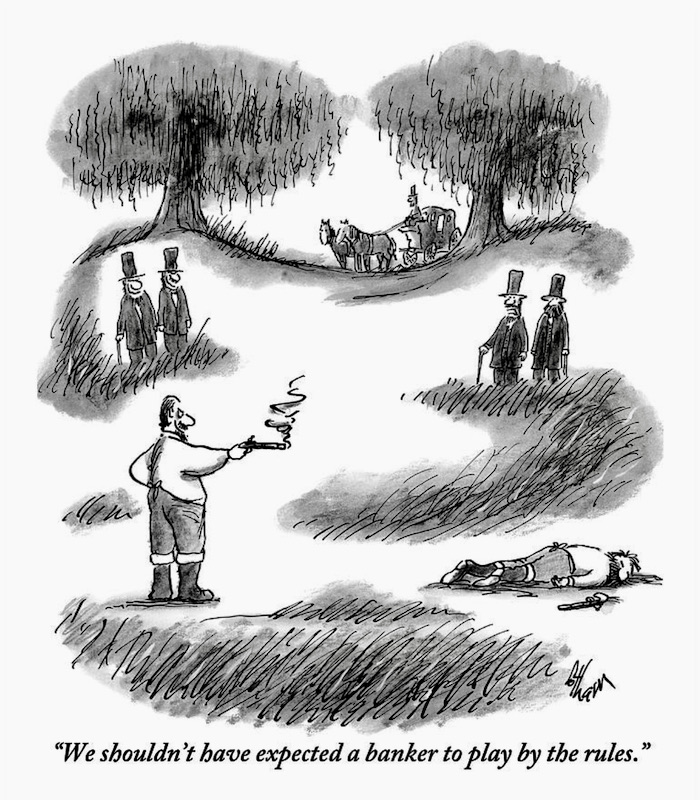 The duelists stood back to back and began the requisite number of paces before turning to fire their pistols — except that the banker wheeled around partway through and shot his opponent — dead — in the back. The cartoon plays on the stereotype of bankers as reckless and driven only by self-interest: Bad, bad Banker Brown / The baddest man in the whole damn town.