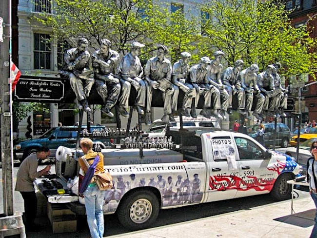 a piece of conceptual art (what I’ll call Skylunch III) taking off on a sculpture (Skylunch II) reproducing a photograph (Skylunch I) showing construction workers eating lunch on a girder high in the sky. Skylunch II and III are mounted on trucks so that they can easily move from place to place.