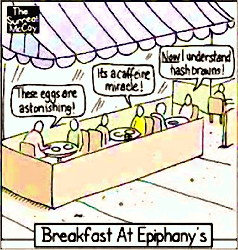 (#5) Breakfast at Epiphany’s, a cartoon playing on Breakfast at Tiffany’s, using the noun epiphany ‘a moment of sudden revelation or insight’
