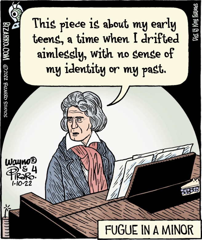 Then, in #1 the composer depicted there — call him Batock /bétàk/, mostly Beethoven, a bit of Bach — has written a fugue in A minor about when he was a minor. Wrote a fugue about when he was an emo kid in a fugue (state), drifting aimlessly, with no sense of his identity or his past.