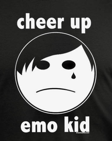 … Often seen as a subculture, emo also signifies a specific relationship between fans and artists and certain aspects of fashion, culture and behavior. Emo fashion has been associated with skinny jeans, black eyeliner, tight t-shirts with band names, studded belts, and flat, straight, jet-black hair with long bangs. Since the early to mid 2000s, fans of emo music who dress like this are referred to as “emo kids” or “emos” … The emo subculture is stereotypically associated with the socially oppressed, sensitivity, misanthropy, introversion and angst, as well as depression, self-harm and suicide.