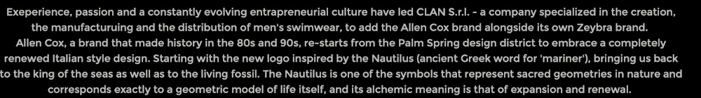 Now, getting information about the details of magazine ads from 30 or so years ago is no easy task. I found Photo C on the Male Model Retro / Uomo Classico Facebook page for 12/2/15. Yes, despite the American-sounding Allen Cox name and the California beach vibes of the brand, the parent business is now the Italian CLAN company (Allen Cox Beachwear is one of its five brands).