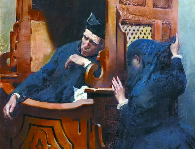 (#4) Juan García Martínez (Spanish painter, 1828-95), The Penitent (1884) — showing, in particular, the grill, or screen, separating the priest and the penitent